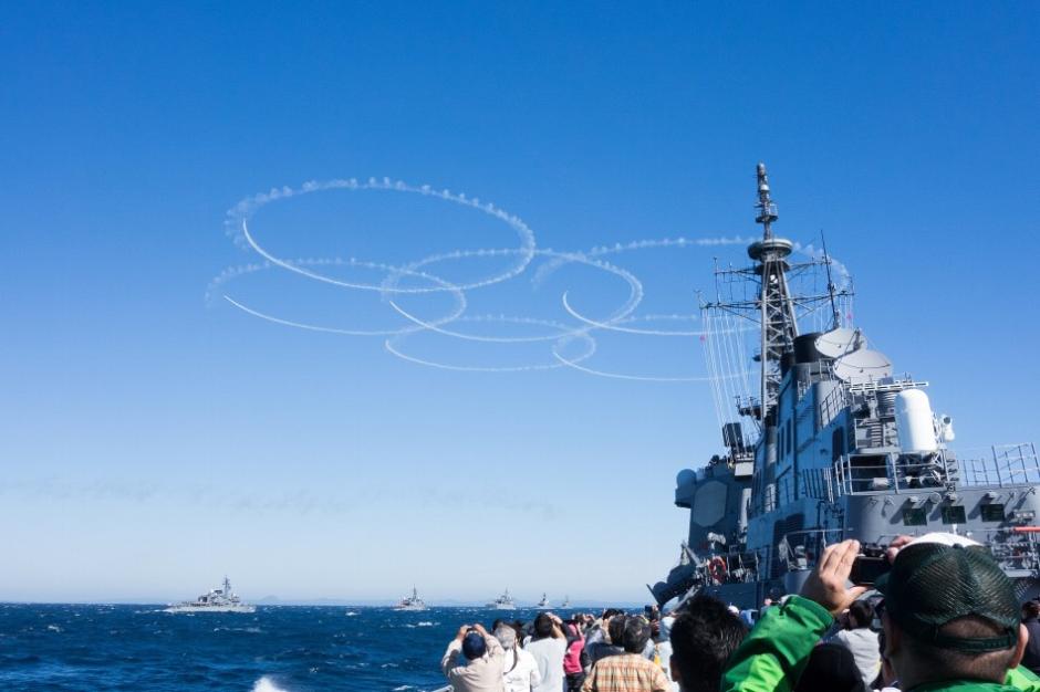 日本海上自卫队将举行年度阅舰式。近日,日本海上自卫队进行了多次彩排活动,最新服役的“出云”号准航母公开亮相,最新型P-1反潜机也打出诱饵弹飞过,日本航空自卫队的“蓝色冲击波”表演队则在彩排海域上空划出整齐的6个圆圈表示庆祝。