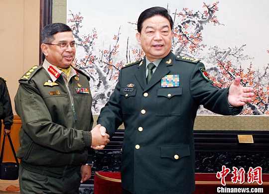 12月3日下午,中国国务委员兼国防部长常万全在北京八一大楼会见来访的孟加拉国陆军参谋长贝拉尔上将。