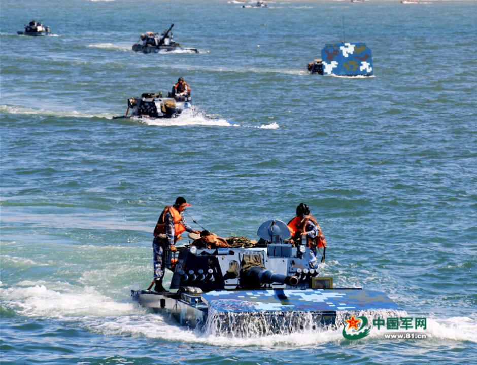 日前,东海某海域,一支由登陆舰组成的登陆输送群,在导弹护卫舰和歼击机的掩护下,沿着扫雷破障舰艇开辟的航道,高速驶抵某岛屿滩头,成功把某陆战旅装甲突击群输送上岸。这是东海舰队某登陆舰支队为把战法研究理论成果转化为现实战斗力而进行的一体化区域协作实兵演练。