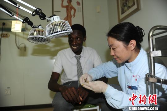 12月7日,格林纳达,中国海军和平方舟医院船中医正给一名格林纳达患者进行针灸治疗(江山 摄)