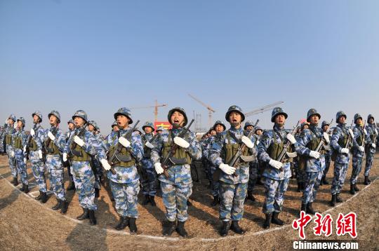 中新网青岛12月8日电8日上午,北海舰队在某训练基地实战化训练场举行2015年新兵授衔仪式暨入伍训练结业典礼。2000余名新兵接受舰队首长检阅,分科目展示实战化训练成果。
