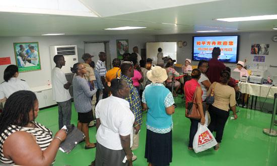 12月7日,执行“和谐使命-2015”的和平方舟医院船抵达格林纳达后展开医疗服务。图为当地就诊人员在医院船检伤分离区进行登记。(江山 摄)