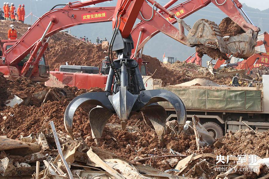 武警交通部队“变形金钢”正在清理深圳滑坡客中的钢铁混凝土堆积物。