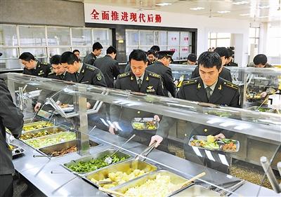 陆军领导机构官兵在集中供应保障中心就餐。(邵敏 摄)