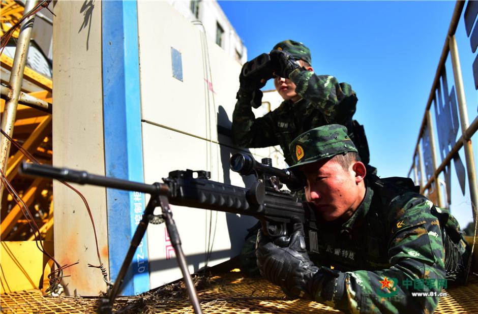 1月26日,狙击手瞄准目标。近日,武警安徽省总队第二支队以新颁布实施的《反恐法》为依据,研究反恐战法,组织城市反恐处突演练,提升部队技战术水平,确保春节期间遇有情况能够快速出动、高效处置。