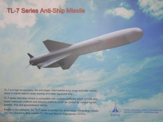 美媒称,现场工作人员表示,TL-7是一款反舰导弹,能够从战斗机发射(TL-7A),从陆上发射(TL-7B),还能从舰艇上发射(TL-7C)。涡轮喷气发动机使该导弹能以0.8-0.85马赫的速度实现180公里的射程。