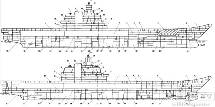 图上为“库兹涅佐夫”号航母侧视线图,下图为设想的001A型航母侧视线图,001A型航母在去除航母发射井结构后,机库可像前整体拓展15米左右,机库面积增加10%左右。