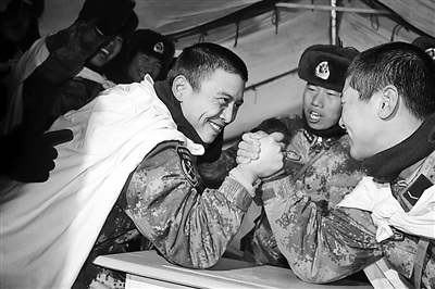 冬季演兵场上,新疆军区某炮兵团广泛开展小评比、小竞赛活动,激发官兵训练热情。图为1月1日,新老兵在野外宿营帐篷里进行掰手腕比赛。(何方龙摄)