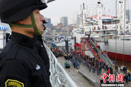 当地时间下午1时,编队3艘军舰缓缓靠泊汉堡港。德方在码头举行了隆重的欢迎仪式,中国驻德国史明德大使、驻汉堡杨惠群总领事、华侨华人、中资机构人员、留学生代表及德军方人士700余人前来迎接,随后还分批次参观了长白山舰。