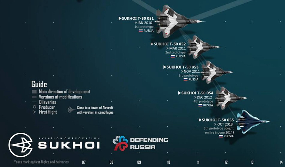 近日,俄罗斯媒体公布了T-50第五代战斗机的族谱图。从图中可以看出,T-50战斗机未来将被命名为“苏-50”系列服役,有多个衍生型号并且出口到多个国家。