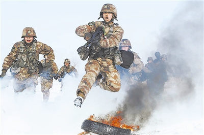 新疆军区某团设置复杂逼真的战场环境,从难从严摔打部队。图为1月底该团官兵进行穿越火障训练。(石冰摄)