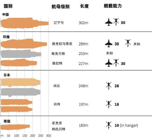 日本目前拥有的“日向”号和“出云号”艘航母。不过受日本《和平宪法》的限制,这两艘航母上只能搭载直升机,扼杀日本一切超出自卫范围的军事发展的念想。而泰国的航母,由于规模较小,作战能力较弱,常年停留在港口,很少执行出海任务,可以忽略不计。