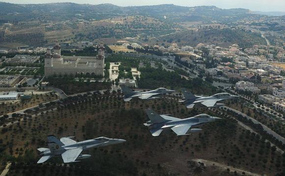 资料图:约旦空军F-16与美军F/A-18编队飞行。