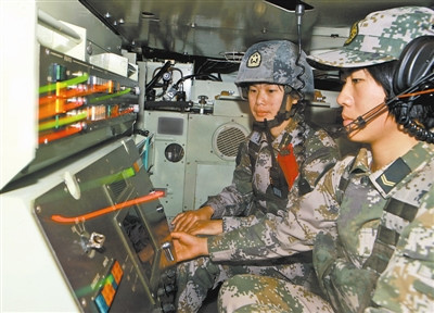 副旅长李建华介绍说,占领阵地后伪装车辆时负重量大,开始是号手完成各自操作后,再合力来实施伪装。这样虽然人多力量大,但战车暴露时间长,易被敌侦察发现。观摩男兵连演示后,女兵们决心克服困难,将车内操作、车外兵器展开与车辆伪装同步进行。开始伪装时,女兵总跟不上男兵的节奏,经过一段时间的强化训练,很快赶上了男兵,达到了战场防护要求。