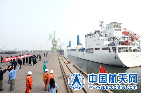 3月16日,远望22号运输船缓缓停靠在天津港码头,长征七号运载火箭合练箭历时3个月圆满完成合练任务,胜利归来。