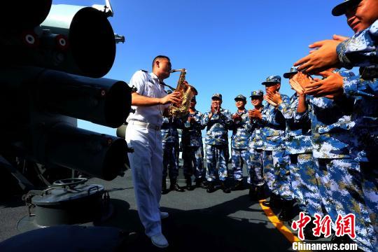“乐器专家”王连生在益阳舰前甲板为值班官兵演奏乐器。 代宗锋 摄