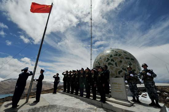 6名青年典型与阵地官兵在甘巴拉雷达站举行庄严肃穆的升旗仪式。朱西迪/摄