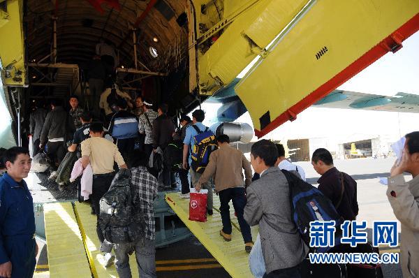3月3日,在苏丹首都喀土穆国际机场,从利比亚撤离到苏丹的中国公民正在登上中国空军运输机准备回国