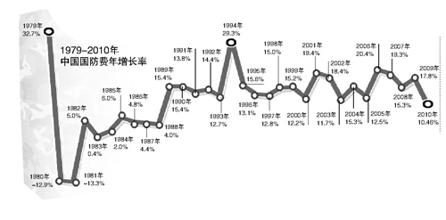 法晚在统计中发现,国防费增幅较高的两年出现在1979年和1994年。1979年国防费年增长率达到32.7%,1994年达到29.3%。至今为止,这两年的增幅一直保持在前两位的位置。