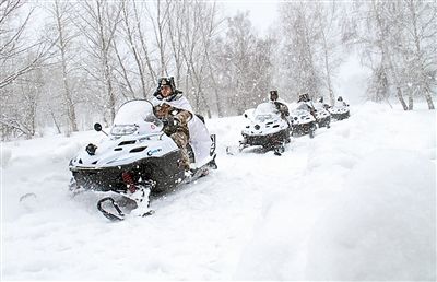 内地已是春暖花开,新疆北部边防一线却依旧雪花飞舞。新疆军区克孜乌雍克边防连中士高小龙与11名战友,驾驶国产新型摩托雪橇碾冰压雪,巡逻在边防线上。新疆军区装备部部长魏满湖告诉记者,为提升边防部队执勤巡逻效率,减轻官兵巡逻强度,他们根据边防需求实际,将消失10年之久的摩托雪橇重新配发到降雪较多的边防一线连队。