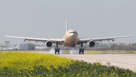 图片展示了阿联酋空军第一架A330 MRTT在空客军机公司赫塔菲基地降落。