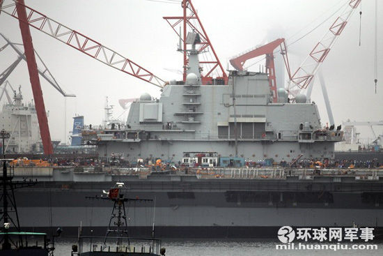 据外媒传言,中国第一艘航母瓦良格号将于7月1日进行海试,6月30日,环球网记者来到瓦良格航母所在位置附近,根据记者现场观察,虽然瓦良格号从外观看来主体工程已经完成,主要武器系统、着舰系统及电子设备等主要舰载装备也已安装完毕,但航母甲板上仍旧一片繁忙,工人众多,甲板上摆放的大量施工设施依旧保持原位,没有任何正在进行清理的迹象,在多个工位上还在进行焊接操作,舰上的施工车辆也频繁工作,车辆吊臂还将施工人员吊送到航母舰岛最上方的烟囱附近进行施工作业,从6月30日当天工作时间内的各种表象看,瓦良格号应该仍旧处于全力施工状态,与海试状态仍旧有一段距离。