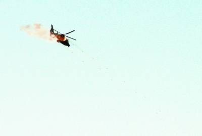 笔者在现场看到,伴随着直升机旋翼的巨大轰鸣声,担任空中攻击任务的陆航团某新型武装直升机分队,率先出击,以密集火力直摧“敌”地面目标,建立空中走廊,为突击队员插入敌腹地提供登陆场。