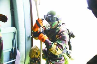 “跳!”特战连长崔向东一声令下,两名特战队员手握缆绳,顺势垂直快速滑下。着地后,队员们迅速取出枪支呈战斗状态,掩护后面的战友机降。