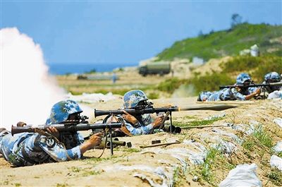 7月下旬,某岸滩,海军某陆战旅组织的一场抢滩登陆作战演练激战正酣。陆战步兵在水陆坦克的引导下,迅速向“敌”前沿阵地发起冲击。与此同时,两栖侦察队队员搭载直升机悄然机降到“敌”后方阵地,迅速实施破袭行动。