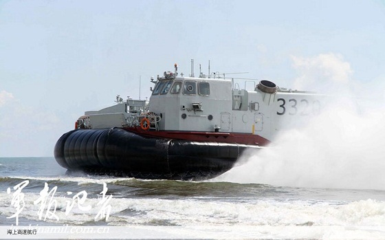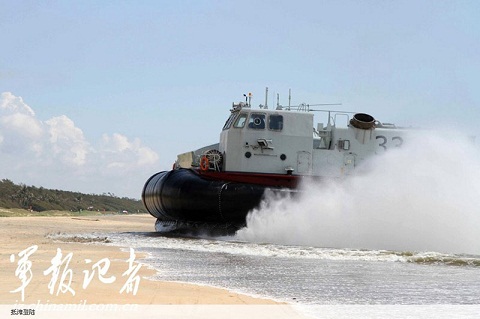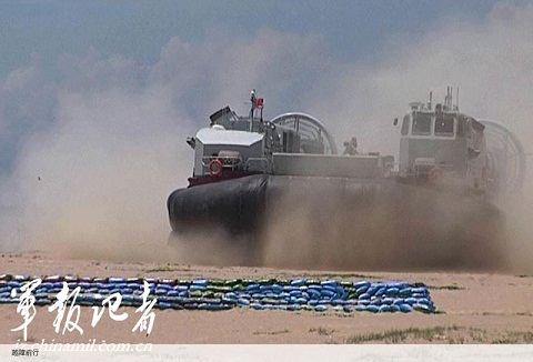 某型气垫登陆艇进行复杂海况航行、抢滩登陆、滩头越障等科目的训练。