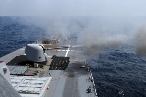 8月22日,演练中美海军DDG-54驱逐舰主炮开火