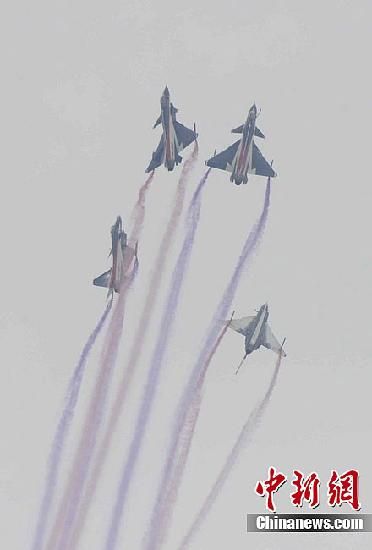 8月28日,长春某军用机场上空,“天之翼”、“红鹰”、“八一”飞行表演队在吉林长春首届航空开放日预演上进行精彩的飞行表演。图为“八一”表演队进行飞行表演。