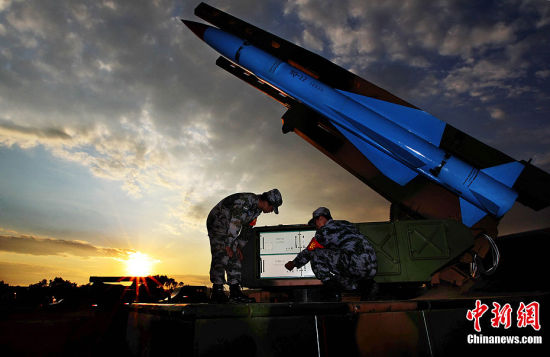随着警报拉响,抗击海上低空来袭目标演练展开。很快,地空导弹硕大的发射筒高高耸立起来,目标指示雷达开始徐徐转动,搜寻着海空之间的每一个角落。