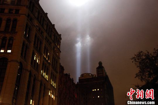 9月8日晚,两道强光从纽约世贸中心遗址的两个倒塌的大楼底座处直刺天际,以此纪念9·11十周年。中新社发 孙宇挺 摄