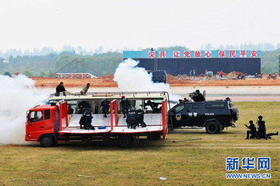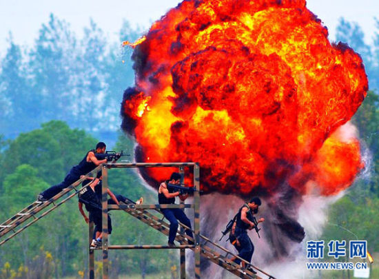 图为特警演示劫持人质暴力恐怖案件处置演练。2011年10月20日,全国公安特警“大练兵”成果汇报演练在武汉市人民警察实战训练基地举行。经过八个月的练兵洗礼,来自全国各地的18支特警队为我们展示了精彩的实战演练。新华网发