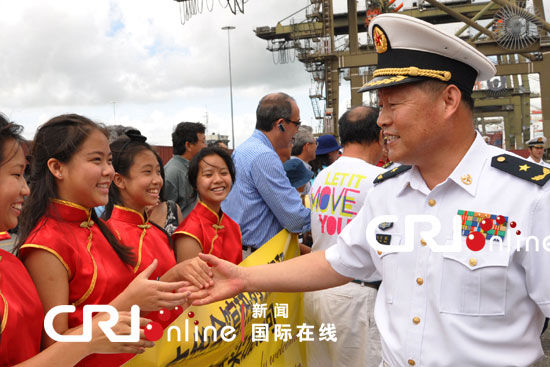 "和谐使命-2011"任务海上指挥员邱延鹏少将与参加欢迎仪式的华裔青少年握手。肖中仁摄