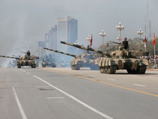 MBT2000主战坦克为了适应装配乌克兰的6TD-2二冲程发动机而对后车体的三热片做了一些改动。图为巴基斯坦陆军MBT2000主战坦克部队参加阅兵式。