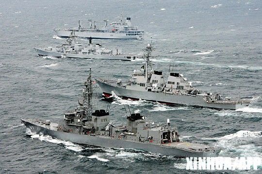 资料图:2007年4月16日,日本海上自卫队和美国、印度海军的军舰在日本房总半岛附近的太平洋海域进行联合训练。新华社/法新