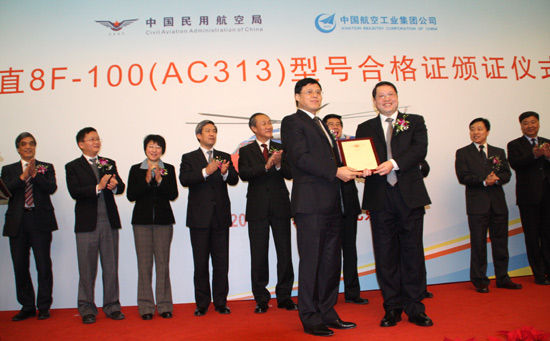 2012年1月5日, 由中国航空工业集团公司(中航工业)自主研制的13吨级AC313大型民用直升机获得了由中国民用航空局颁发的型号合格证,这标志着这款亚洲最大吨位直升机成为世界上第一型取得4500米海拔地区A类适航证的民用直升机,即将投入市场在抢险救灾、森林防火、交通运输、海上作业、医疗救护、旅游观光、公务飞行等领域发挥巨大作用。
