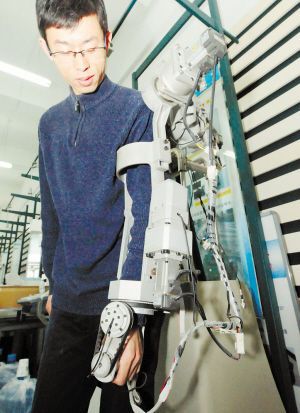 可用于因受外伤或疾病造成的手臂运动障碍患者,可以实现水平面和竖直面的轨迹运动,能够对肩关节、肘关节进行训练。(哈尔滨新闻网-新晚报 本报记者 史轶夫/文 刘阳洋/摄)