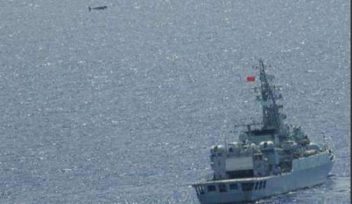 资料图:日本自卫队拍摄的中国海军舰队通过冲绳近海时舰艇上空的无人机