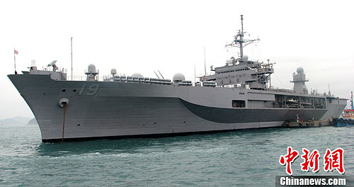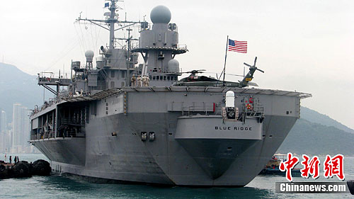 美国第七舰队两栖指挥舰“蓝岭号”,于3月15日抵达香港,经停5天至3月20日。“蓝岭”号拥有精良的卫星通讯设备,负责支援第七舰队执行区域任务。(中新社发 茹萦莹 摄)