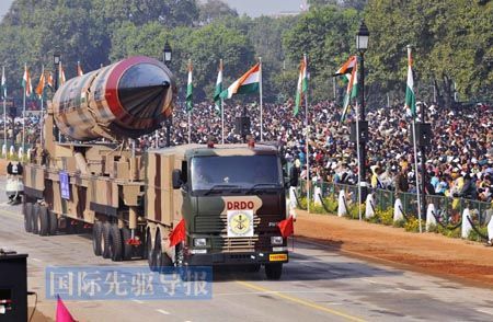 资料图:印度军队在2009年的阅兵式中展示“烈火-3”型导弹。本报记者 王晔/摄