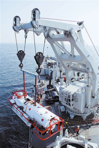 救生船完成任务浮出水面,官兵正为它系挂起吊缆。