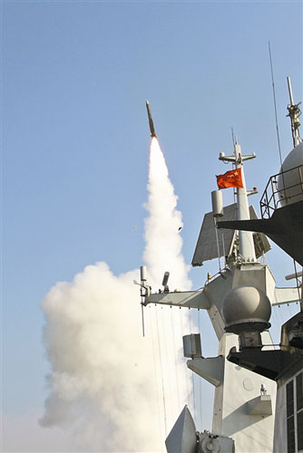 新型舰空导弹发射瞬间。(解放军报 廖宇飞 摄)