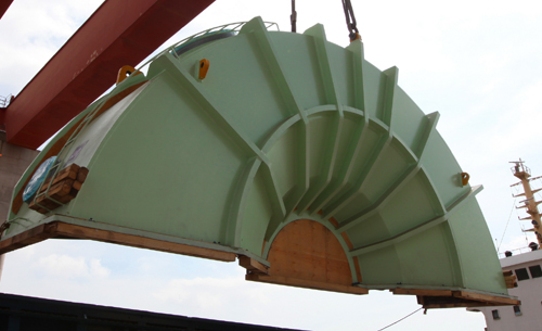 7月1日,1号机组汽轮机1号低压外缸在秦皇岛哈电重装码头装船发运,7月4日抵达三门核电重件码头;3号低压外缸于7月4号装船发运,7月9号抵达三门核电重件码头;2号低压外缸于7月12日具备发运条件。