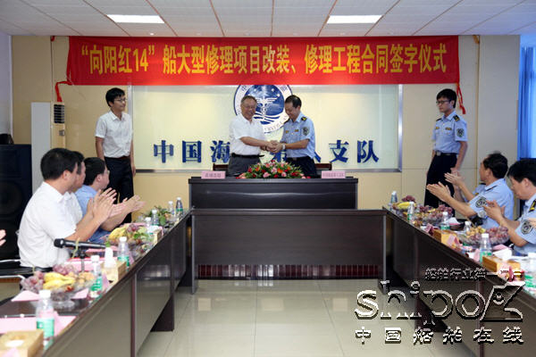 9月2日,“向阳红14”船大型修理项目改装、修理工程合同签字仪式在中国海监第八支队举行,黄埔造船董事长、党委书记钟坚和中国海监南海总队李永波副总队长代表双方在合同文本上签字。目前,双方正紧锣密鼓落实合作细节,该船计划于10月份进厂。