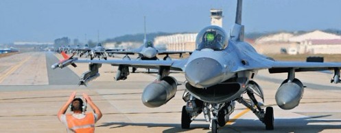 群山空军基地跑道上的韩国空军F-16K战机。