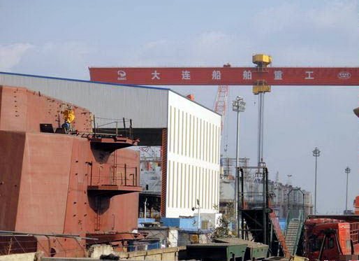 资料图:在大连造船厂被目击的一个大型船舶构件(左侧)被指是辽宁号舰岛的复制品