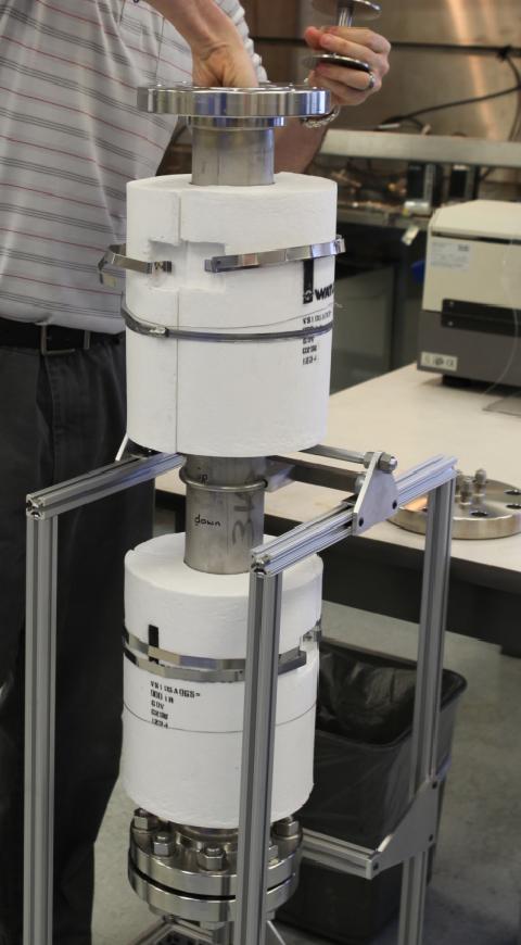 在实验室内,工作小组制造了一台36千克的设备,看似长0.9米的金属管。这个反应器能容纳3.4升物质,这些物质在538℃下燃烧,是家用烤箱最高温度的两倍。
